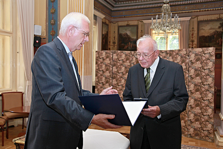 Předseda Akademie věd ČR prof. Jiří Drahoš na návrh Vědecké rady AV ČR udělil v roce 2013 profesoru Martinu Černohorskému čestnou oborovou medaili Ernsta Macha za zásluhy ve fyzikálních vědách. Foto: Jednota českých matematiků a fyziků