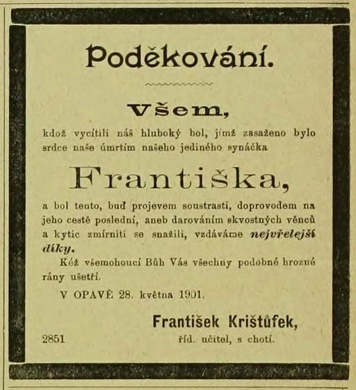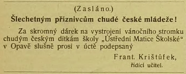 „Bylo vykonáno posvěcení místním farářem Vincencem Kubalou, na to ujal se hned slova velezasloužilý předseda Matice Opavské pan František Krištůfek, řídící obecné školy v Opavě. Třebaže vlas mu zbělal dlouholetou činností na roli dědičné, přece zvonivým hlasem, vznešenou tklivou mluvou, zapsal se do srdce dětí, učitelky a obecenstva, čímž vykonal slavnostní akt otevření mateřské školy. Hned na to zazněly milé tóny pěveckého spolku Křižkovského z Opavy, který jemně zazpíval slavnostní sbor. Potom hudba vesele zahrála vyzvavše všechny do připravené zahrady. Tam teprve sešla se nejen celá dědina, ale i širší okolí bylo přítomno tak významného dne. Jmenovaný vlastenecký spolek vystoupil několikráte svými zpěvnými čísly, čímž zvýšil slavnostní náladu. Tam znova se ujal slova pan předseda Matice Opavské František Krištůfek, promluviv tklivá slova k srdcím občanů hlavnických i dětí, uváděje důležitý význam mateřské školy v Hlavnici, jejíž vydržování Matice Opavská převzala a výchovu dětí, příští součástky národa svěřuje učitelce slečně Marii Kubesové. Ta poděkovala chvějícími se upřímnými slovy a slíbila s čistou láskou a svědomitostí pracovati na cíli vytčeném“.³
