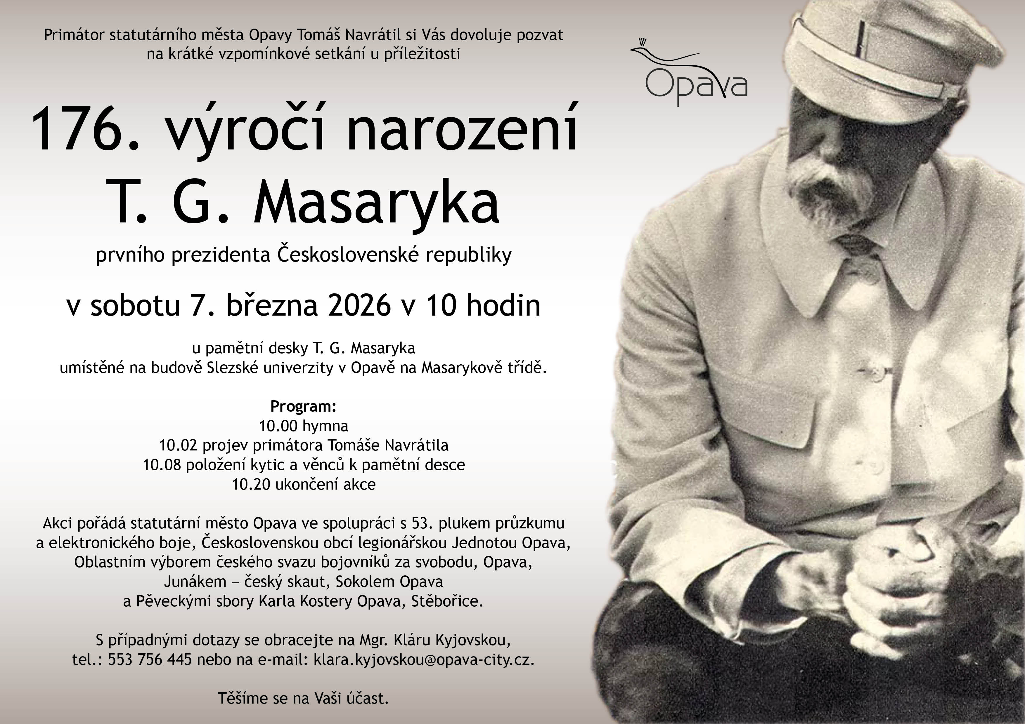 V sobotu 7. 3. si Opava připomene 176. výročí narození prvního československého prezidenta Tomáše Garrigua Masaryka. Vzpomínkové setkání se uskuteční v 10 hodin u pamětní desky na budově Slezské univerzity na Masarykově třídě.