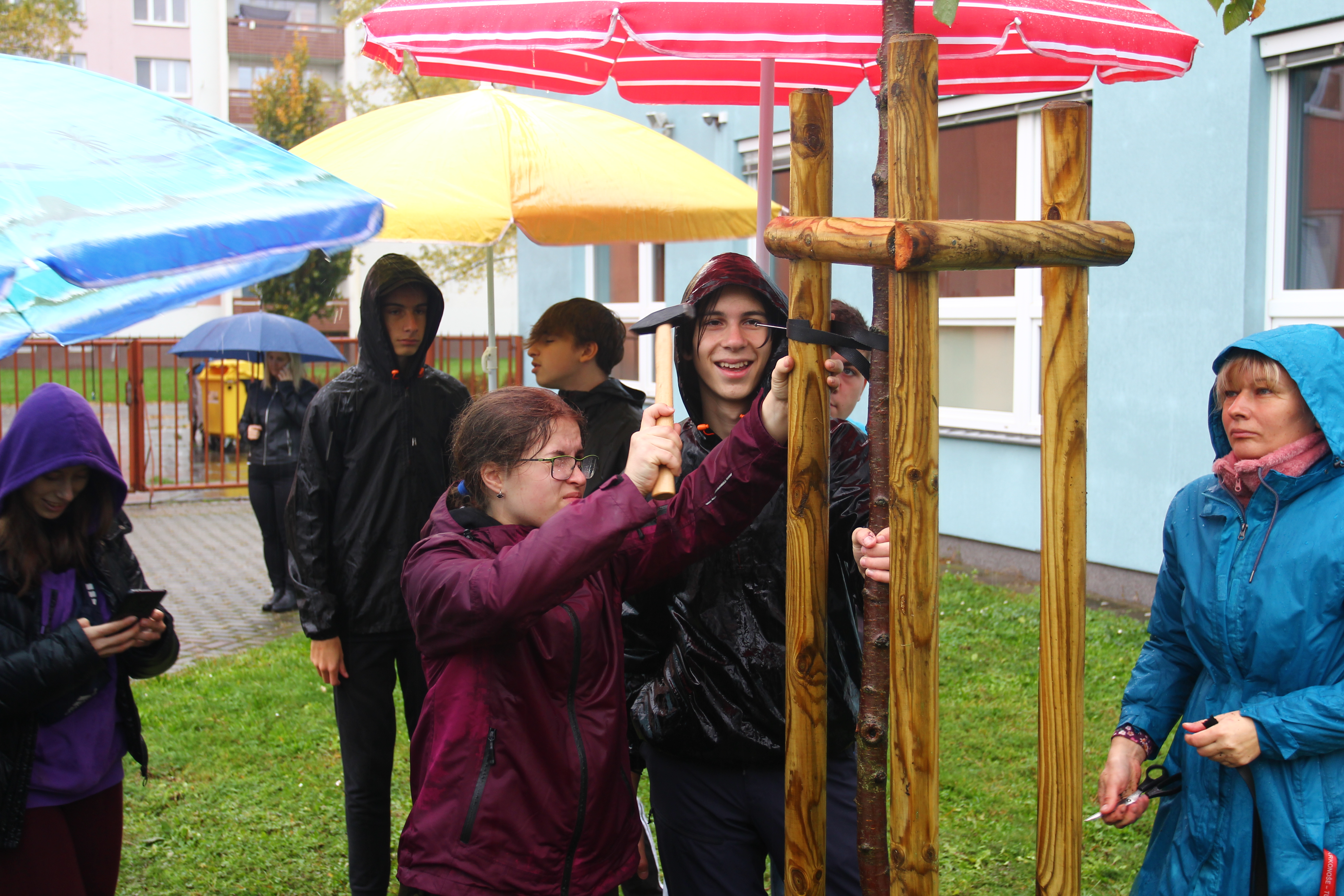 Přestože vytrvale pršelo, děti se s vervou pustily do díla. Správně zasadit strom není jen tak. Vyhloubit jámu, zatlouct opěrné kůly, usadit a zasypat sazenici, přibít příčky, upevnit úvazy a ještě vymodelovat zálivkovou mísu. Barevný a čilý rej s deštníky a nářadím z oken pozorně sledovali jejich spolužáci. A je hotovo! Školní Ekotým si připsal další úspěch.