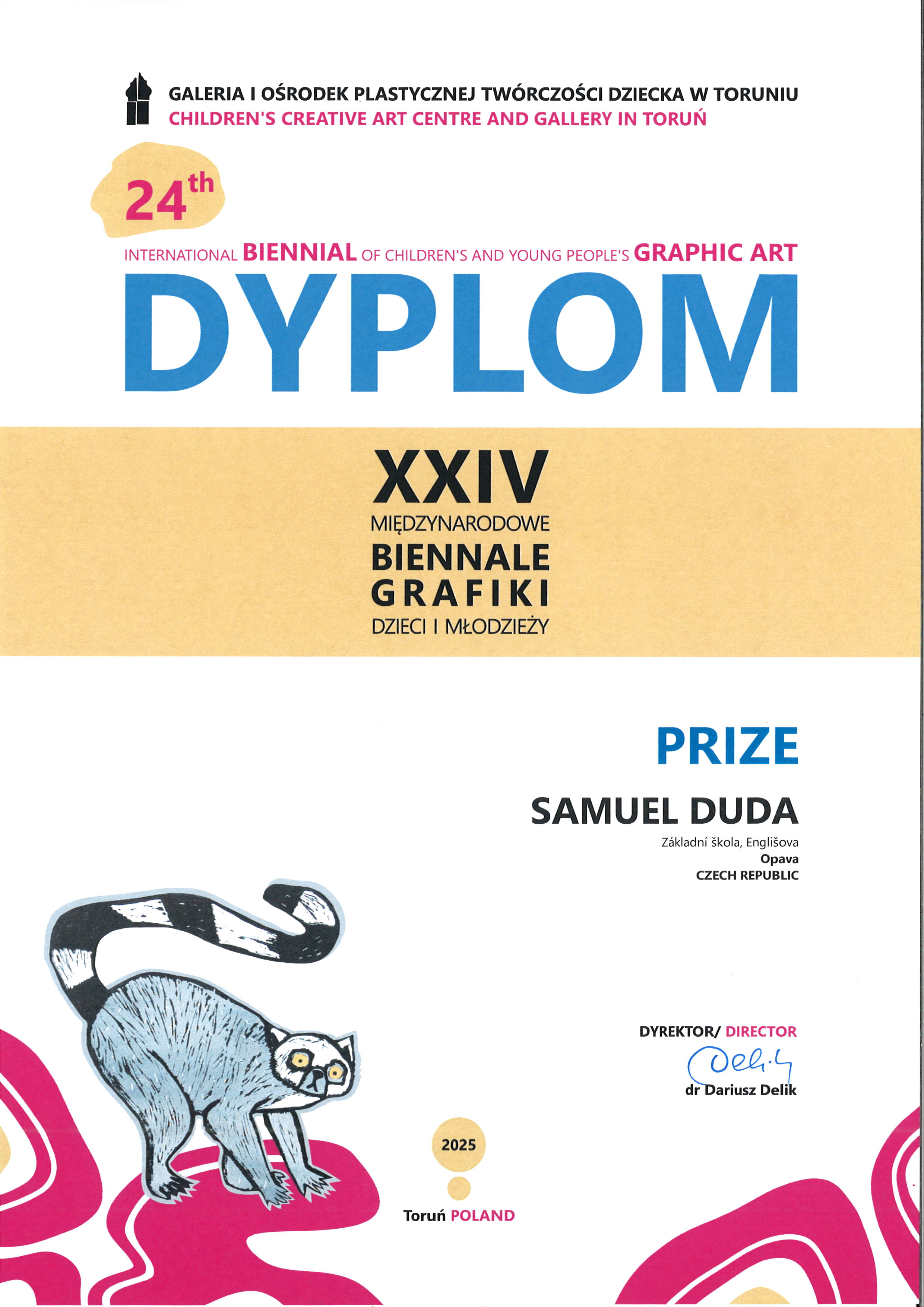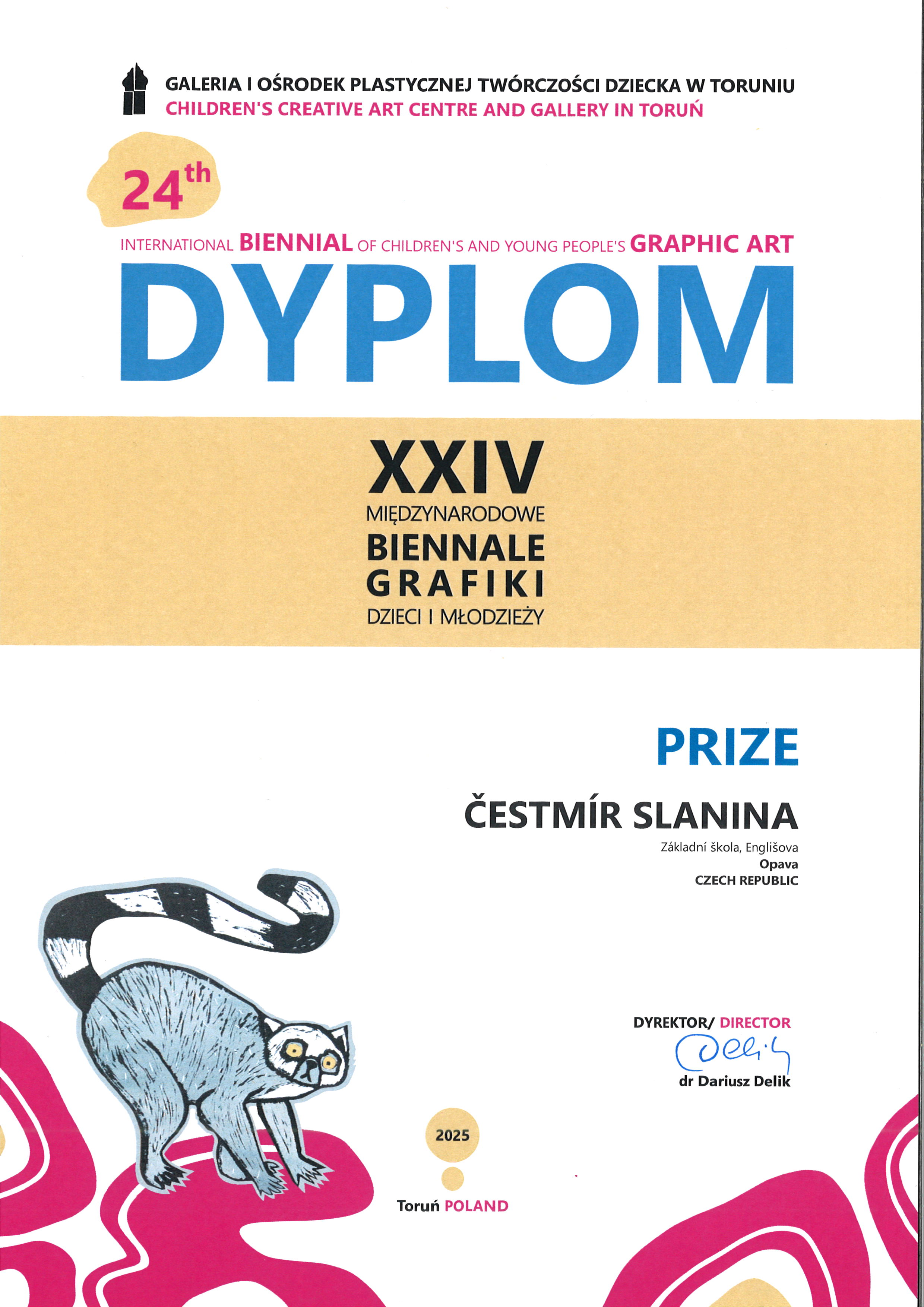 24. ročník mezinárodní dětské výtvarné soutěže Bienále grafiky 2025 v Toruni (Polsko) přinesl mimořádný úspěch dvěma žákům Základní školy Opava, Englišova 82.
