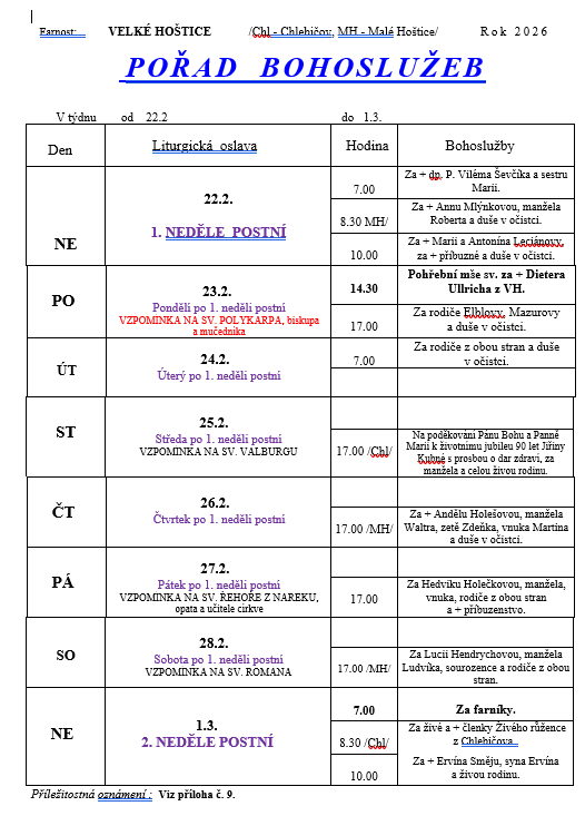 Home Aktuality Pořad bohoslužeb 22.2.2026 Přejít na ... Hlášení rozhlasu Malohoštický zpravodaj Hlučínsko TV Sdružení obcí Hlučínska Fotografie Pořad bohoslužeb 22.2.2026 Publikováno: 21.02.2026 Upraveno: 21.02.2026 Zpět