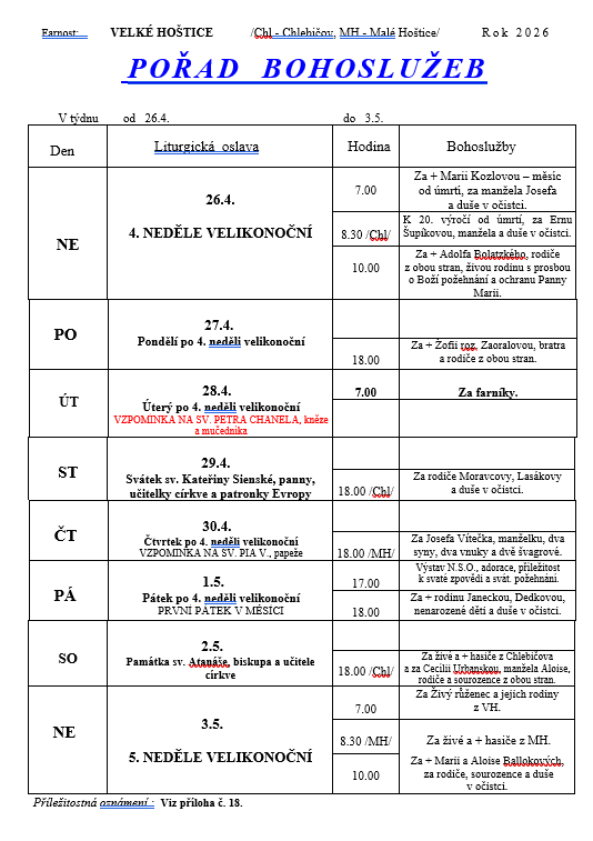 Home Aktuality Pořad bohoslužeb 26.4.2026 Přejít na ... Hlášení rozhlasu Malohoštický zpravodaj Hlučínsko TV Sdružení obcí Hlučínska Fotografie Pořad bohoslužeb 26.4.2026 Publikováno: 27.04.2026 Upraveno: 27.04.2026 Zpět