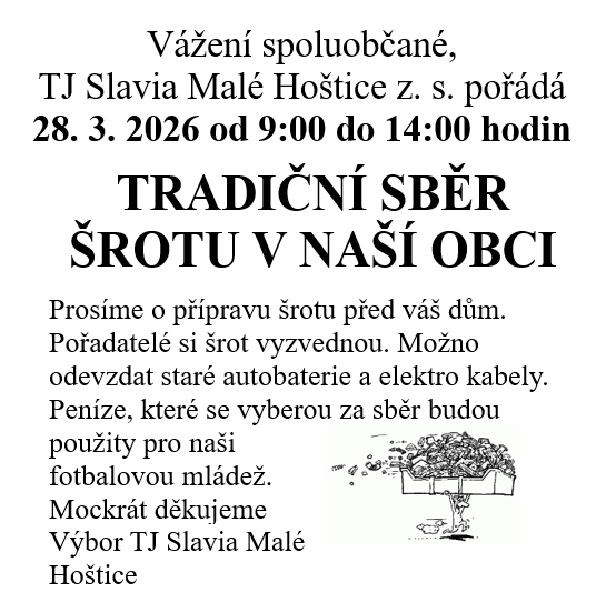 Home Aktuality Sběr šrotu v obci Přejít na ... Hlášení rozhlasu Malohoštický zpravodaj Hlučínsko TV Sdružení obcí Hlučínska Fotografie Sběr šrotu v obci Publikováno: 10.03.2026 Upraveno: 10.03.2026 Zpět