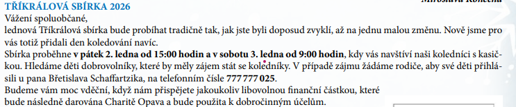 Home Aktuality Tříkrálová sbírka 2026 Přejít na ... Hlášení rozhlasu Malohoštický zpravodaj Hlučínsko TV Sdružení obcí Hlučínska Fotografie Tříkrálová sbírka 2026 Publikováno: 29.12.2025 Upraveno: 29.12.2025 Zpět