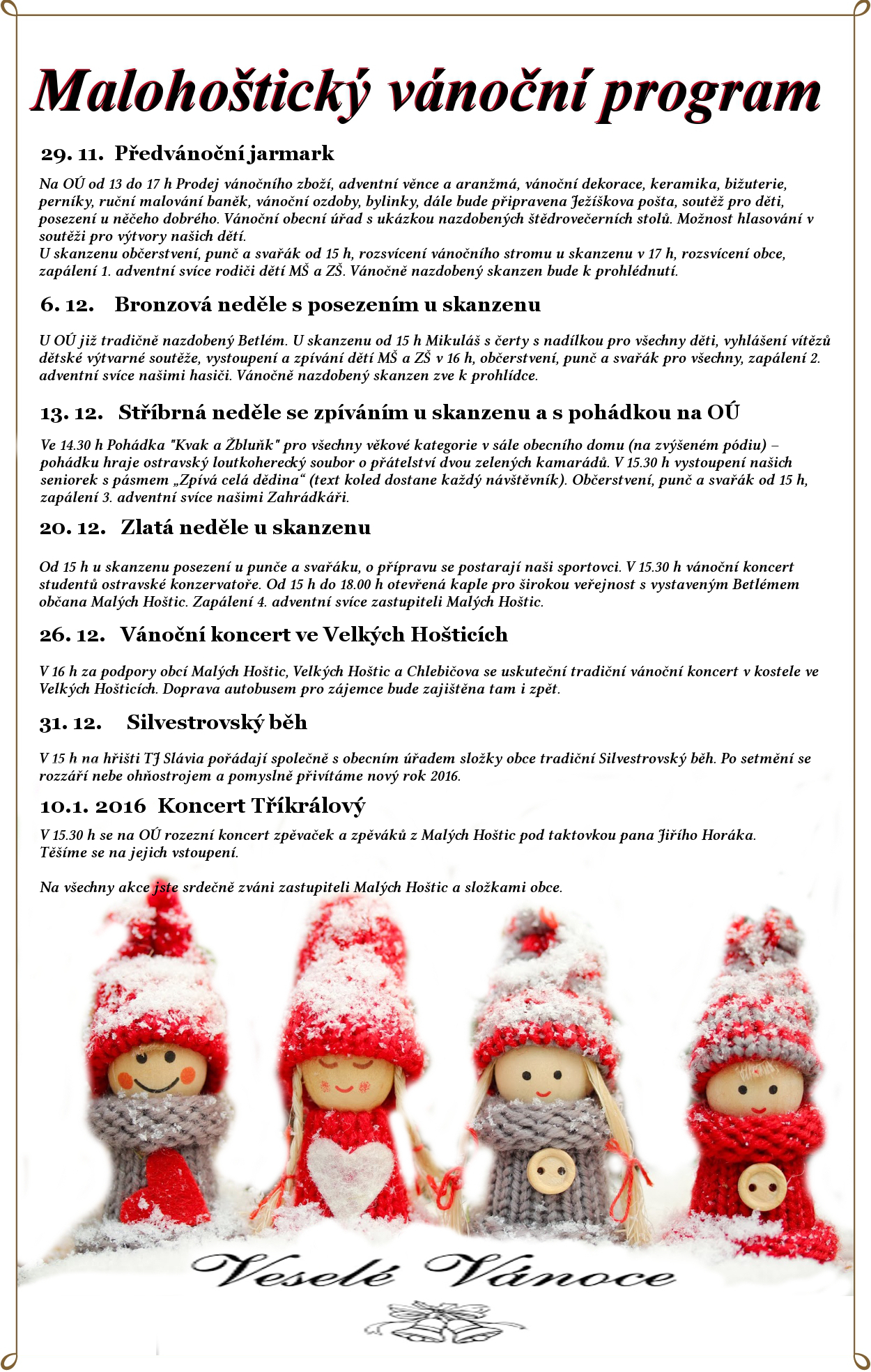Program na vánoční jarmark a adventní neděle v Malých Hošticích, který začne 29. 11. 2015