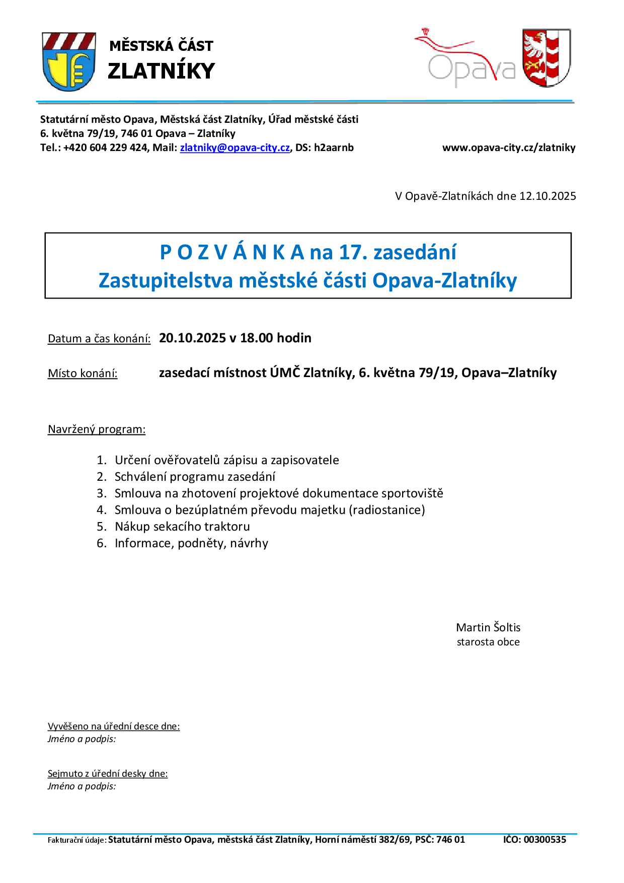 Home Úřad městské části Zastupitelsvo Pozvánky na zastupitelstvo Pozvánka na 17. zasedání Zastupitelstva městské části Zlatníky dne 20.10.2025 Pozvánka na 17. zasedání Zastupitelstva městské části Zlatníky dne 20.10.2025 Publikováno: 12.10.2025 Upraveno: 12.10.2025 Zpět